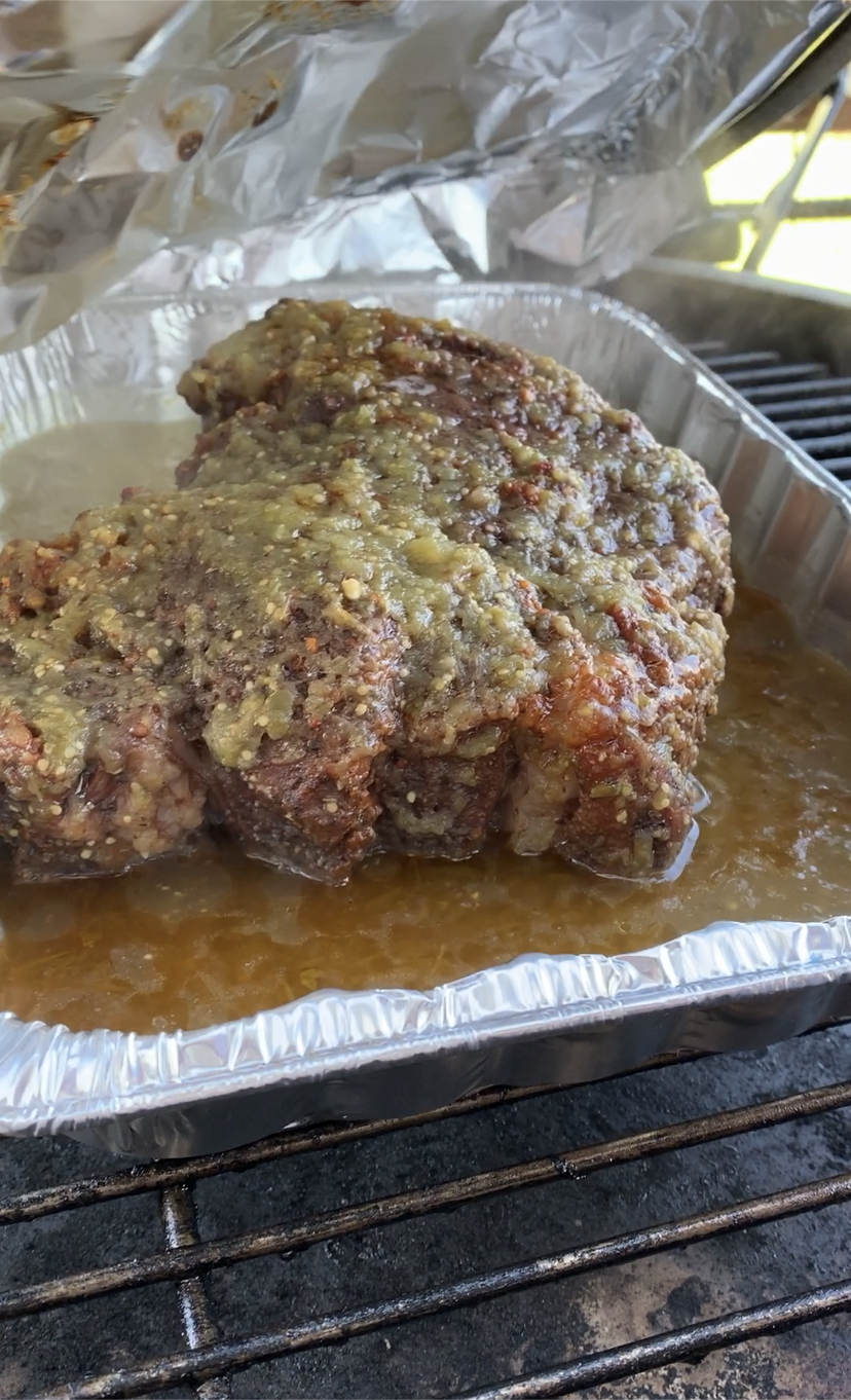 - Put roast in half sized aluminum pan and cover with 2 jars of *salsa verde.